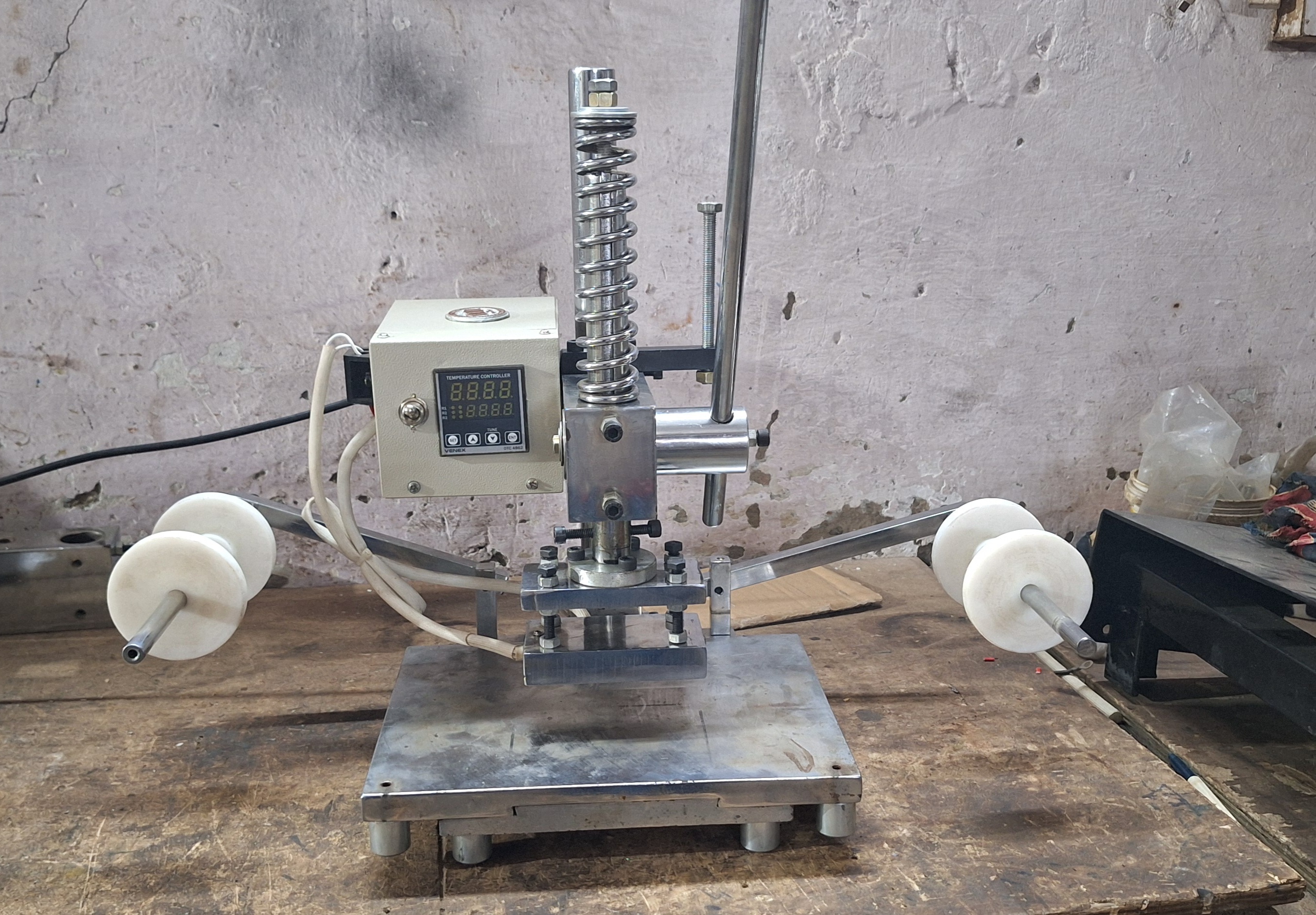 USAGE :- FOR HOT FOIL PRINTING & EMBOSSING ON LEATHER, PAPER, REXINE, WOOD, COATED METAL AND GLASS ,PLASTIC BOX (JEWELLERY BOX, OPTICAL BOX ETC). SPECIFICATIONS :- HEATING PLATE SIZE 4 INCH X 4 INCH (CAN PRINT UPTO 4 INCH X 4 INCH PRINT). WORKING HEIGHT - 1 MM - 200 MM (ADJUSTABLE). HEATER POWER – 500 WATT (CARTAGE TYPE HEATER EASY TO CHANGE WITH IN A MIN). POWER SUPPLY – 230 VOLT 50-60 Hz(CAN BE USE AT HOME ALSO). BASE PLATE SIZE 10 INCH X 8 INCH, SLIDING BASE PLATE. PID CONTROLLER FOR ACCURATE HEAT CONTROLLING (AVOID OVERHEAT). BOTH SIDE FOIL LOADER AND UNLOADER HOLDER. HEAVY MACHINE STRUCTURE WITH CHROME COATED. 1 YEARS ELECTRIC PARTS WARRANTY. WE ALSO SUPPLY DIE BLOCK AND HOT FOIL ROLL.
